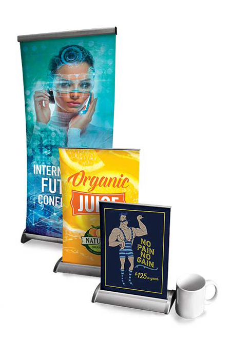 Obtenez un impact maximum avec un effort minimal ! Faites la promotion instantanée de votre marque et produits grâce aux présentoirs de table à bannières rétractables en vinyle de qualité supérieure. Disponible en différentes tailles, ce produit est idéal pour les présentoirs lors de foires commerciales, les orientations universitaires et les conférences et événements en intérieur de toutes sortes, ainsi que pour les petits comptoirs dans les cafés ou les restaurants.