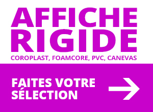 Les affiches rigides sont parfaites pour toutes les situations: elles sont légères à transporter, durables et solides lors des déplacements. Elles sont de plus faciles à installer avec plusieurs options : que ce soit sur un pied en forme de ‘H’ (h-stand) ou encore avec des œillets afin de les fixer soit avec de la corde, des vis ou même avec des serre-câbles (tie-wraps) dans certains cas.
