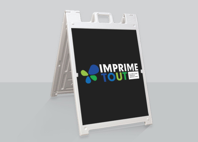 Signicade avec structure solide en PVC blanc avec 2 encarts en coroplast blanc 4mm imprimé pleines couleurs recto (4/0 CMYK)